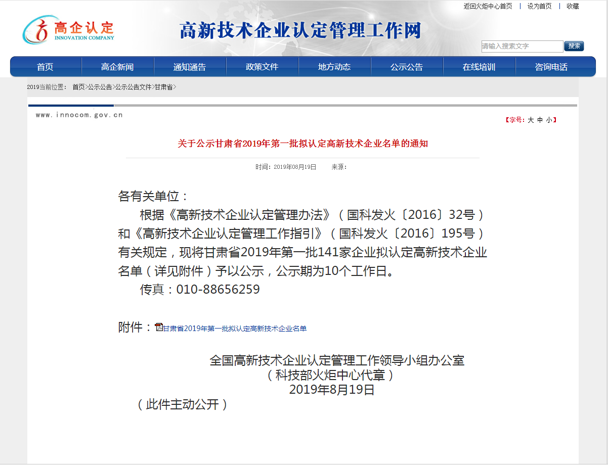 根據(jù)《高新技術企業(yè)認定管理辦法》(國科發(fā)火〔2016〕32號)和《高新技術企業(yè)認定管理工作指引》(國科發(fā)火〔2016〕195號)有關規(guī)定,經(jīng)公司申報、地方初審、專家審查等嚴格的申報程序,于2019年8月19日在“國家高新技術企業(yè)認定工作網(wǎng)”上公示了“甘肅省2019年第一批擬認定高新技術企業(yè)名單”甘肅安卓工程技術有限公司榜上有名。