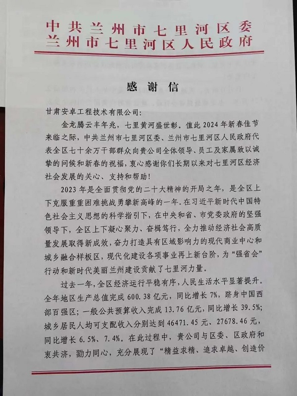 歲末年關(guān),新春將至。近日,中共蘭州市七里河區(qū)委、蘭州市七里河區(qū)人民政府發(fā)來感謝信。